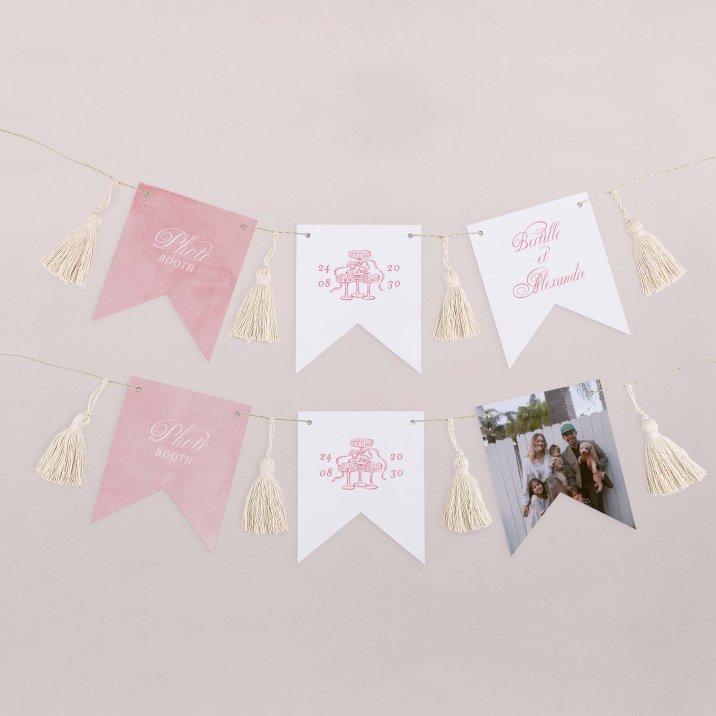 Cette guirlande de 16 fanions recto-verso se personnalise avec vos prénoms, la photo de votre couple, la date de votre mariage, un petit mot de bienvenue…