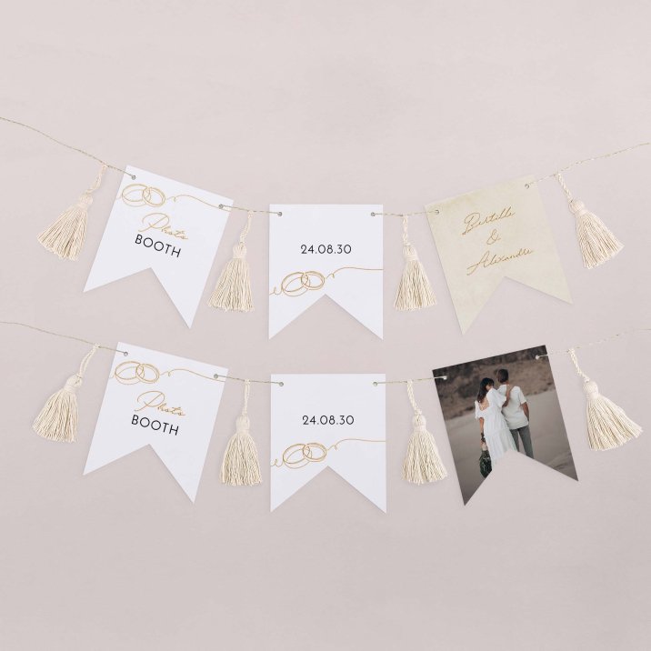 Cette guirlande de 16 fanions recto-verso se personnalise avec vos prénoms, la photo de votre couple, la date de votre mariage, un petit mot de bienvenue…