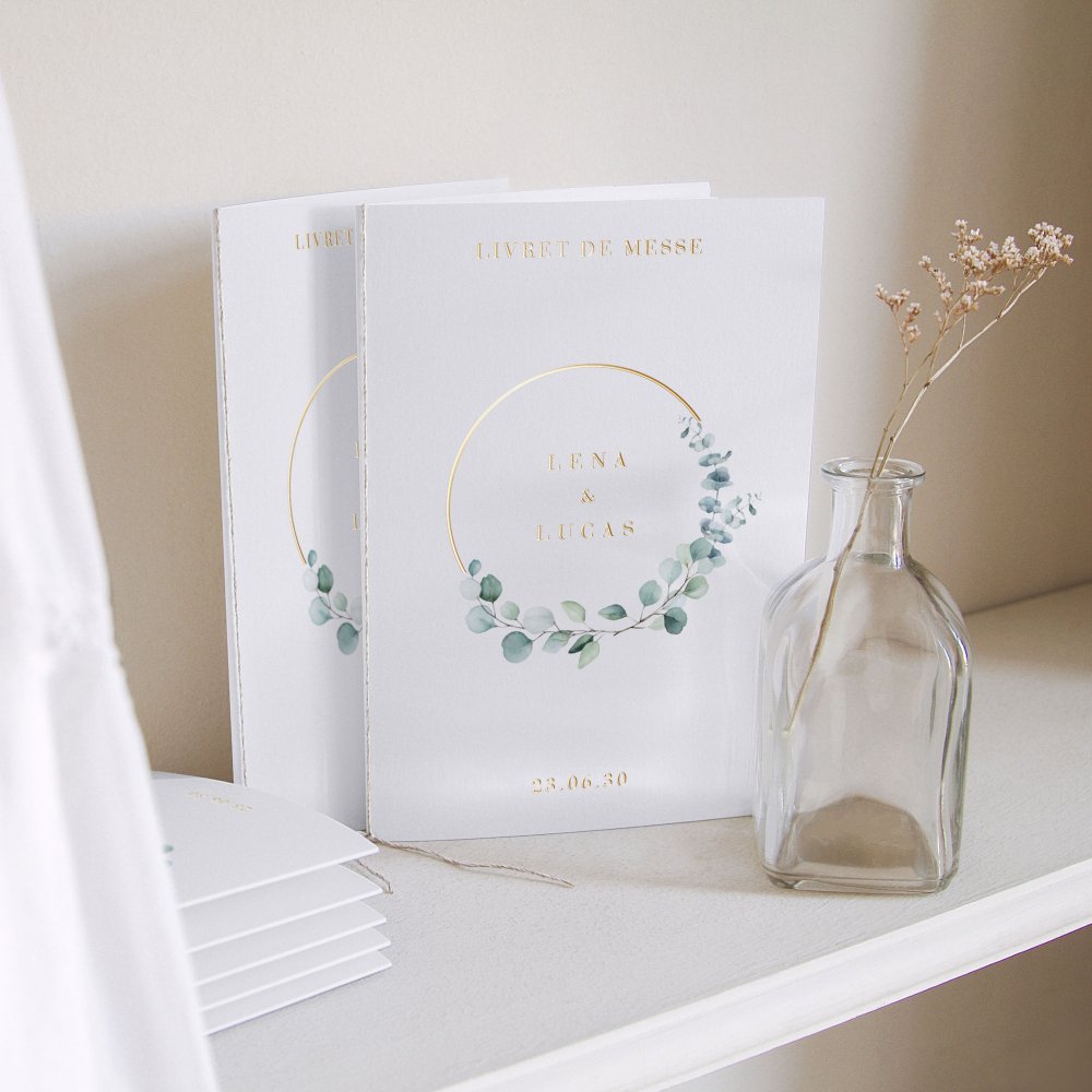 Couverture de livret de messe assortie à votre faire-part, agrémentée d'un ruban (en option et coloris au choix). Les feuillets intérieurs ne sont pas fournis.