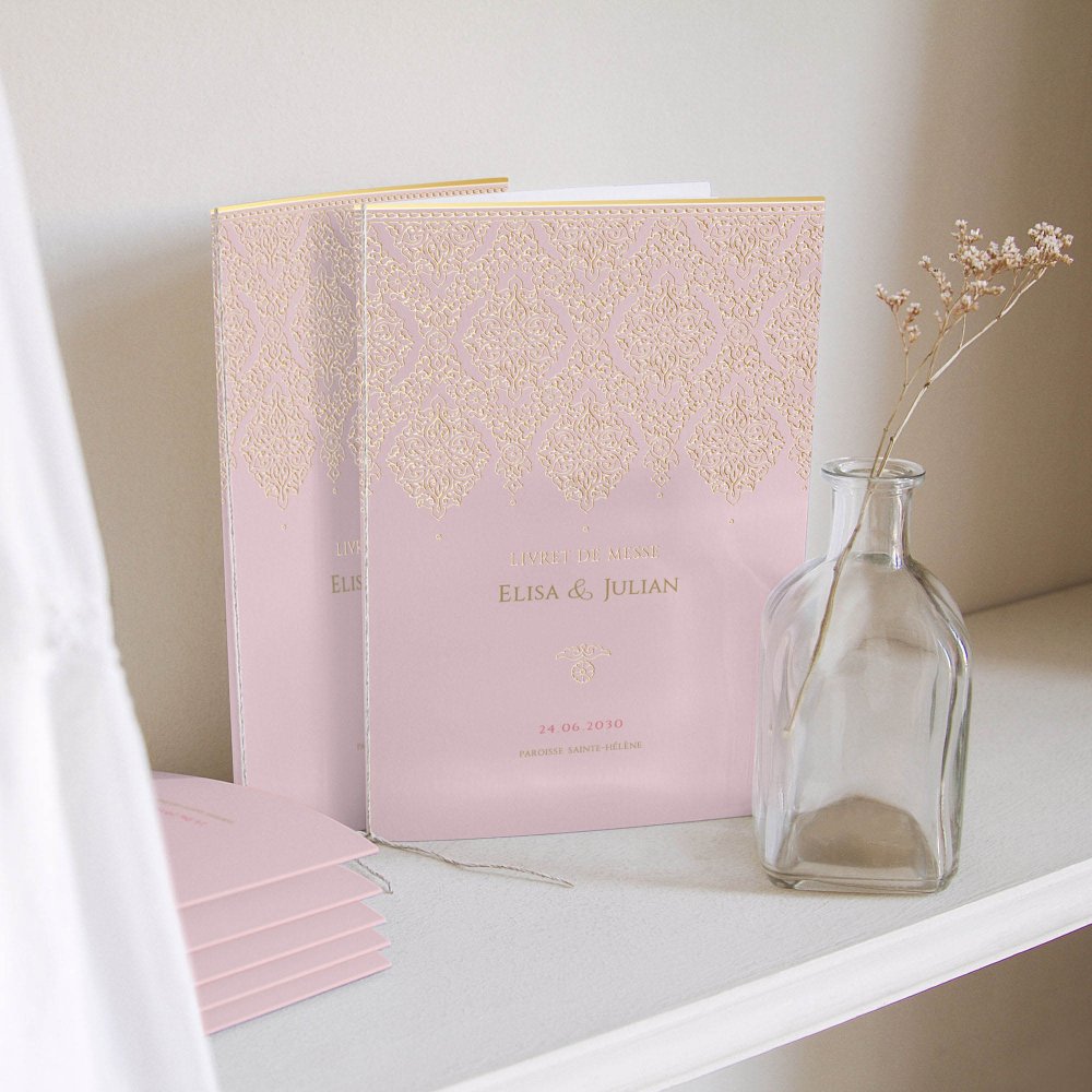 Couverture de livret de messe assortie à votre faire-part, agrémentée d'un ruban (en option et coloris au choix). Les feuillets intérieurs ne sont pas fournis.