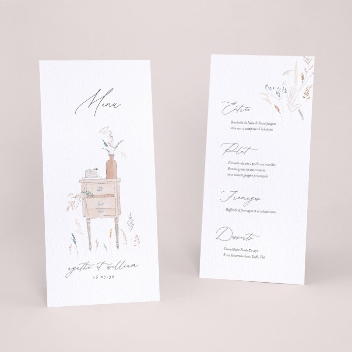 Vous avez établi votre menu de mariage, alors faites-le imprimer sur nos menus assortis à votre faire-part !