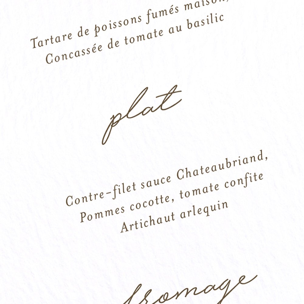 Vous avez établi votre menu de mariage, alors faites-le imprimer sur nos menus assortis à votre faire-part !