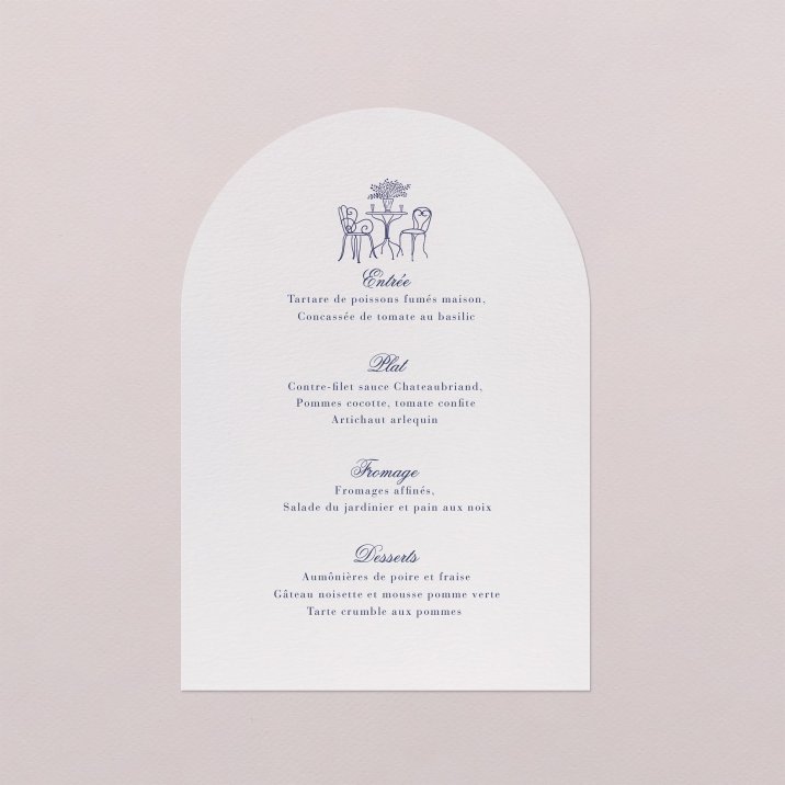 Avec son élégante découpe en forme d'arche, ce menu de mariage, assorti à vos faire-part, complétera merveilleusement votre décoration de table. Présentez-le sur un élégant porte-carte en bois (disponible en option), déposez-en un sur chaque assiette, sublimez-les d’un joli ruban…