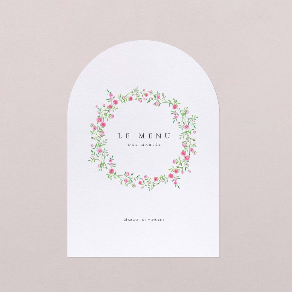 Avec son élégante découpe en forme d'arche, ce menu de mariage, assorti à vos faire-part, complétera merveilleusement votre décoration de table. Présentez-le sur un élégant porte-carte en bois (disponible en option), déposez-en un sur chaque assiette, sublimez-les d’un joli ruban…