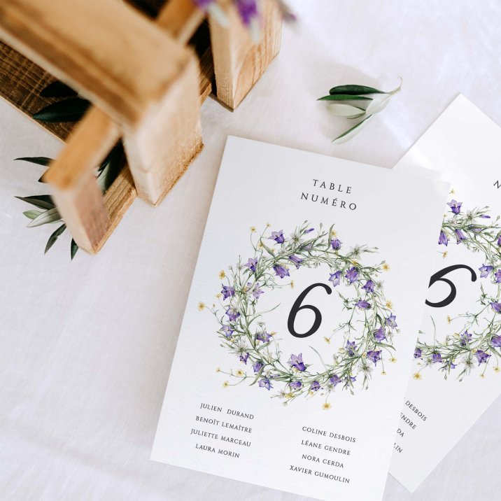 Autant de cartes que de tables, que vous afficherez à l'entrée de la salle pour aider vos convives à se placer à table le plus simplement du monde.
