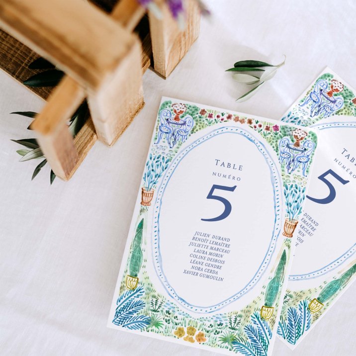 Autant de cartes que de tables, que vous afficherez à l'entrée de la salle pour aider vos convives à se placer à table le plus simplement du monde.