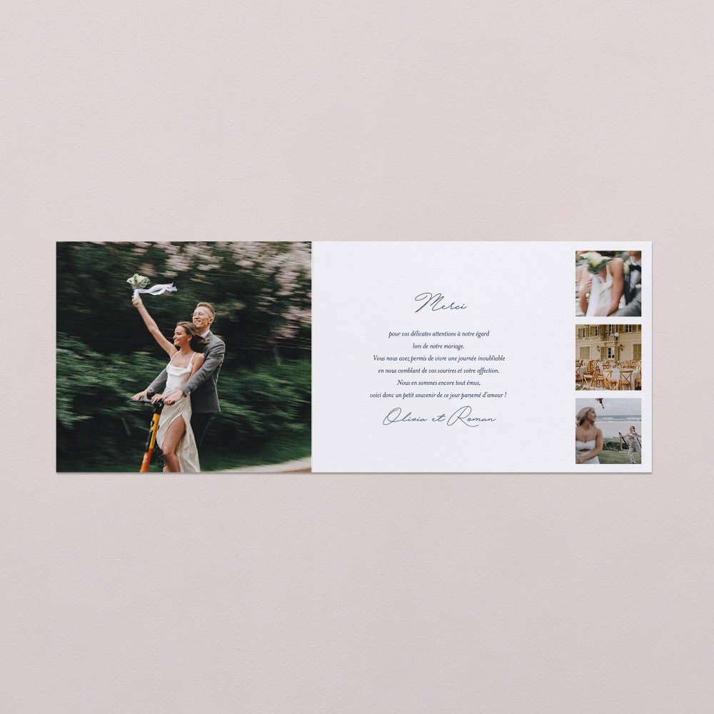 Dites merci à votre famille et vos amis, grâce à cette jolie carte de remerciements mariage. Cette carte paysage grand format se personnalise au recto et au verso avec votre photo et votre message. Un tendre cadeau de papier à envoyer, en souvenir de cette belle journée.