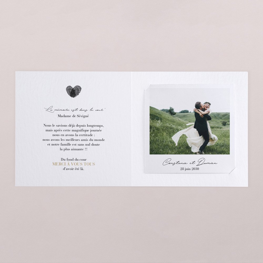 Remerciez les proches présents à votre mariage en leur adressant une jolie carte personnalisée. Cette carte de remerciements s'accompagne d'un cadeau souvenir : un polaroid (non magnétisé) glissé à l'intérieur, qu'ils pourront conserver, afficher, utiliser comme marque-page... en souvenir de cet évènement mémorable.