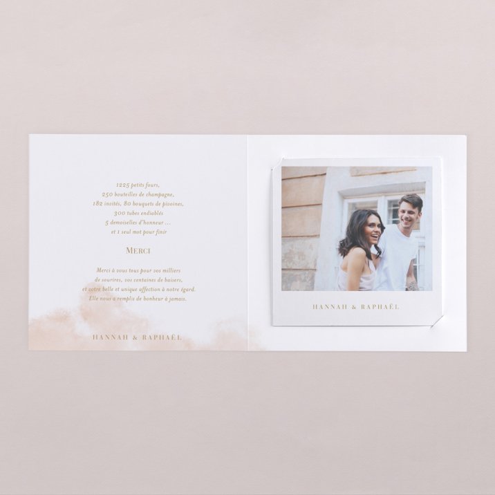 Cette carte de remerciements s'accompagne d'un cadeau souvenir : un polaroid (non magnétisé) glissé à l'intérieur, qu'ils pourront conserver, afficher, utiliser comme marque-page... en souvenir de cet évènement mémorable.