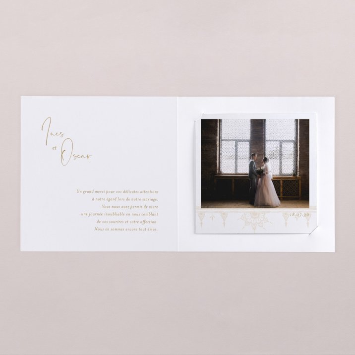 Cette carte de remerciements s'accompagne d'un cadeau souvenir : un polaroid (non magnétisé) glissé à l'intérieur, qu'ils pourront conserver, afficher, utiliser comme marque-page... en souvenir de cet évènement mémorable.