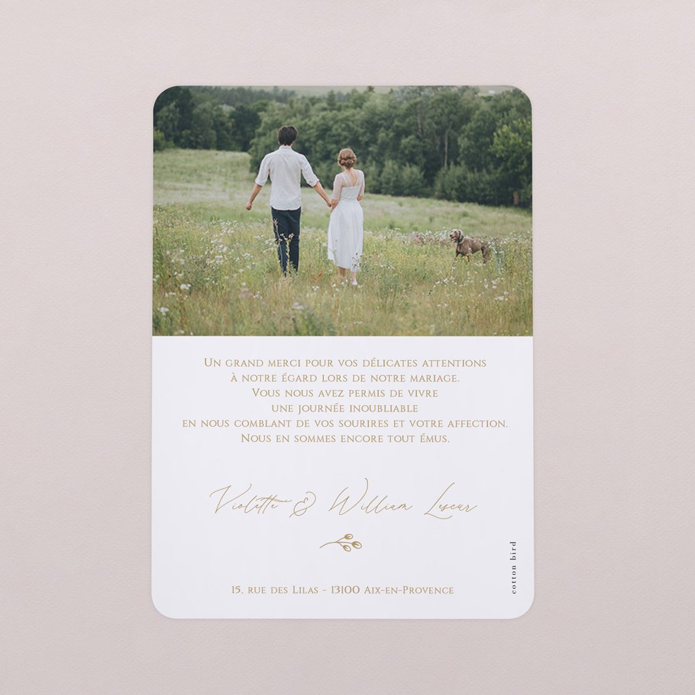 Une grande carte de remerciements en guise de souvenir. Le cadeau idéal pour remercier famille et amis et leur rappeler ces merveilleux moments passés en leur compagnie.