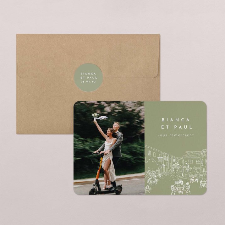 Une grande carte de remerciements en guise de souvenir. Le cadeau idéal pour remercier famille et amis et leur rappeler ces merveilleux moments passés en leur compagnie.