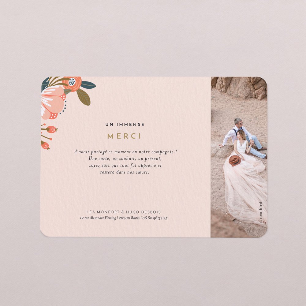 Une grande carte de remerciements en guise de souvenir. Le cadeau idéal pour remercier famille et amis et leur rappeler ces merveilleux moments passés en leur compagnie.