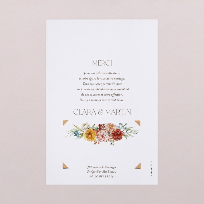 Sur cette création inédite, vos remerciements sont délivrés avec un sachet de graines de fleurs sauvages biologiques. Un cadeau d’invité poétique à planter, qui permettra à vos proches de prolonger le souvenir de cette belle journée.