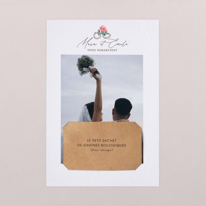 Surprenez vos invités avec cette carte de remerciements mariage originale, accompagnée de son sachet de graines à planter.