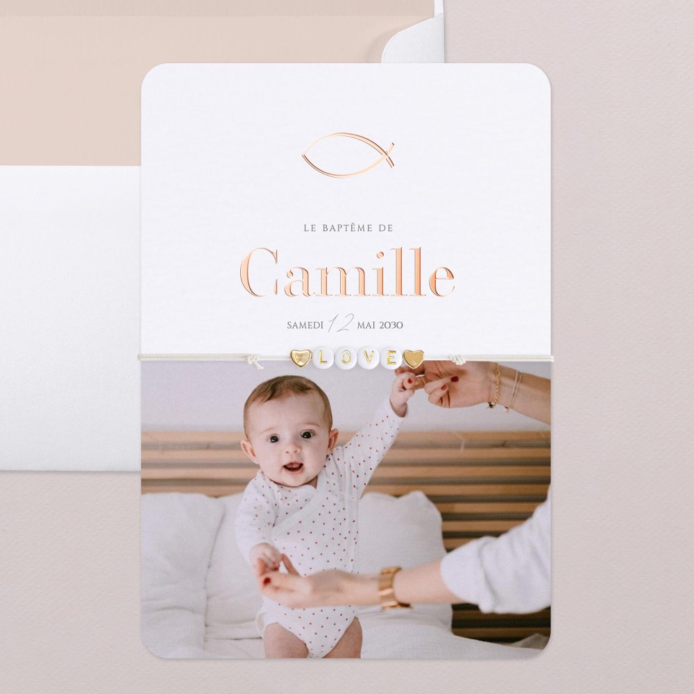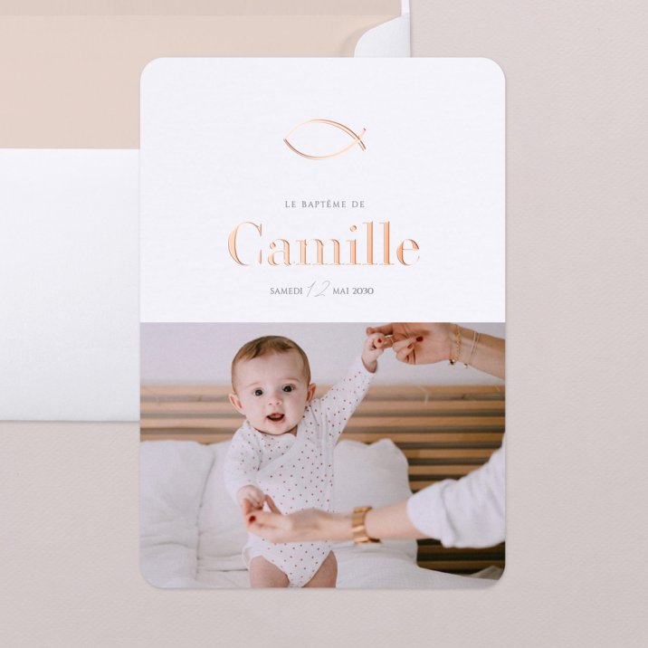 Ce faire-part de baptême présente un format portrait, avec des coins arrondis pour plus de douceur. Il est personnalisable au recto comme au verso.
