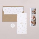 Ce faire-part se compose d'une carte pliée par le milieu et d'un photomaton, glissé à l'intérieur. Vos proches pourront utiliser le photomaton comme marque-page, l'afficher sur leur frigo, un tableau en liège... Un tendre souvenir à contempler au quotidien.