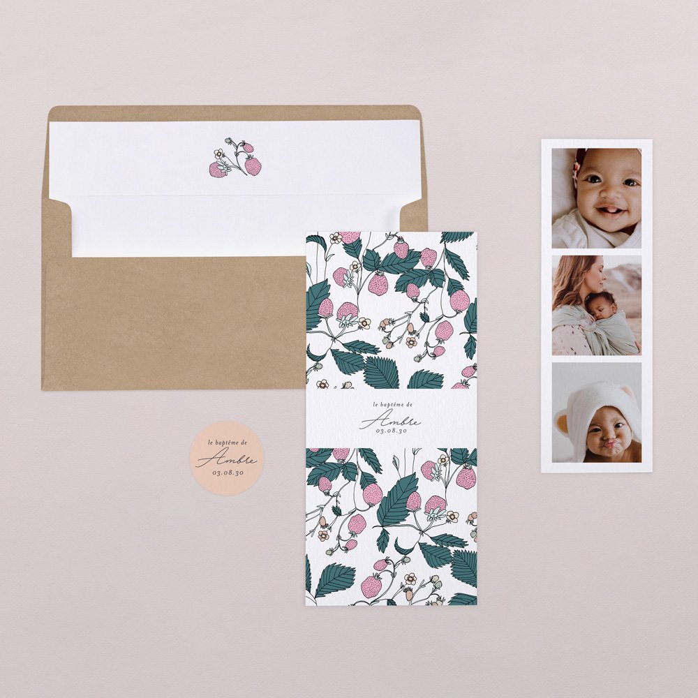Fruité et coloré, le faire-part Fraise des Bois II annoncera avec candeur le baptême estival de votre enfant. Charmez votre entourage avec ce modèle original, qui délivrera les infos clés de l'évènement sous forme de mini symboles adorables.
