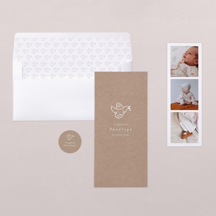 Sur le faire-part de baptême Magdalena, une jolie colombe blanche tient dans son bec une branche d’olivier, symbole de paix et de confiance. Un modèle graphiquement épuré mais riche de sens, parfait pour une cérémonie traditionnelle.
