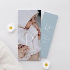 Sur le faire-part de baptême Daphné - bleu, l’initiale du prénom de votre enfant s’appose délicatement sur sa plus belle photographie. Un modèle minimaliste, qui partagera en toute simplicité le baptême.