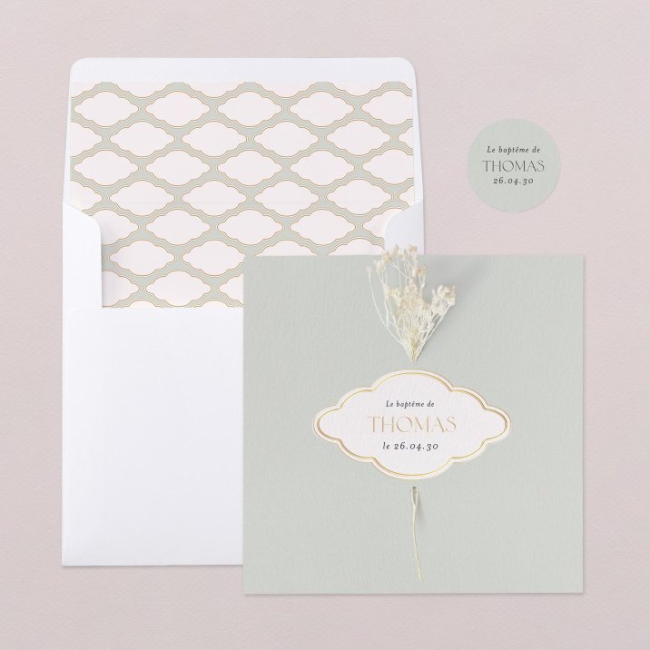 Sobriété et élégance sont les maîtres mots du faire-part de baptême Amédée aux tons vert d'eau... Vos proches seront séduits par la simplicité de ce faire-part, orné du prénom de votre bébé joliment calligraphié et sublimés par une finition dorée.