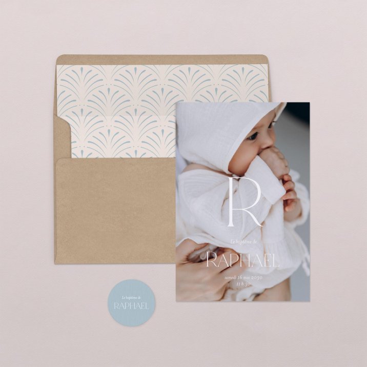 Sur le faire-part de baptême Daphné - bleu, l’initiale du prénom de votre enfant s’appose délicatement sur sa plus belle photographie. Un modèle minimaliste, qui partagera en toute simplicité le baptême.