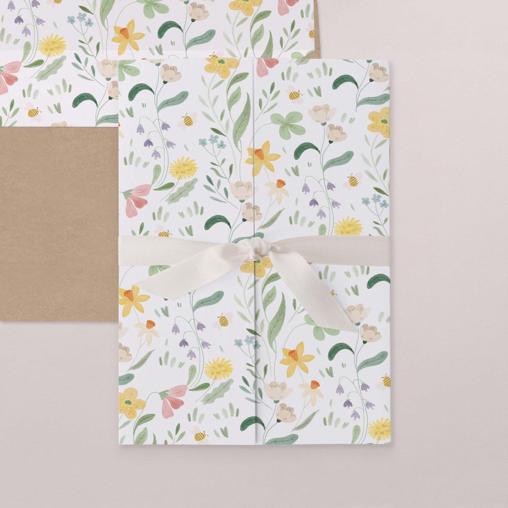 Frais et printanier, le faire-part de baptême Lilly Rose s'habille de jonquilles, violettes, pissenlits et autres fleurs colorées. Agrémenté de petites abeilles, ce faire-part est idéal pour une célébration de baptême au printemps ou en été.