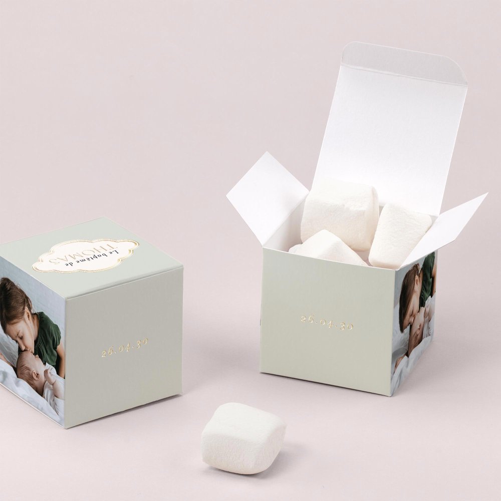 Offrez ce joli cube surprise à vos proches, en souvenir du baptême de votre enfant.