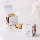 Pour enchanter vos invités, garnissez ce petit cube surprise de délicieuses dragées (disponibles en option), fabriquées artisanalement dans le sud de la France. Nous vous conseillons d’ajouter 20 dragées par boîte (50 g).