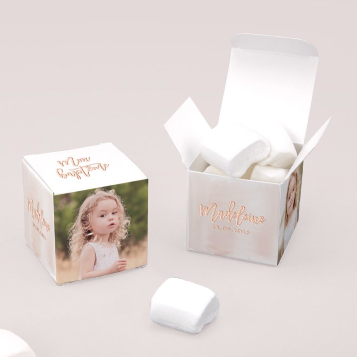 Offrez ce joli cube surprise à vos proches, en souvenir du baptême de votre enfant.