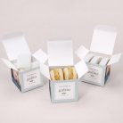 Pour enchanter vos invités, garnissez ce petit cube surprise de délicieuses dragées (disponibles en option), fabriquées artisanalement dans le sud de la France. Nous vous conseillons d’ajouter 20 dragées par boîte (50 g).