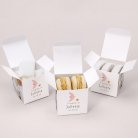 Pour enchanter vos invités, garnissez ce petit cube surprise de délicieuses dragées (disponibles en option), fabriquées artisanalement dans le sud de la France. Nous vous conseillons d’ajouter 20 dragées par boîte (50 g).