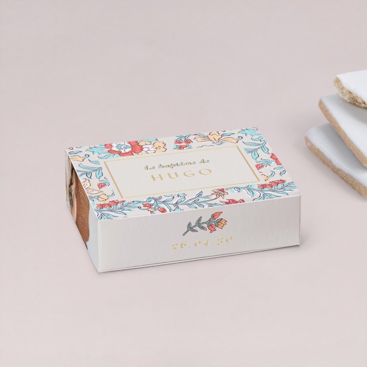 Offrez un élégant souvenir aux proches présents au baptême de votre enfant : la boîte à biscuits personnalisée.