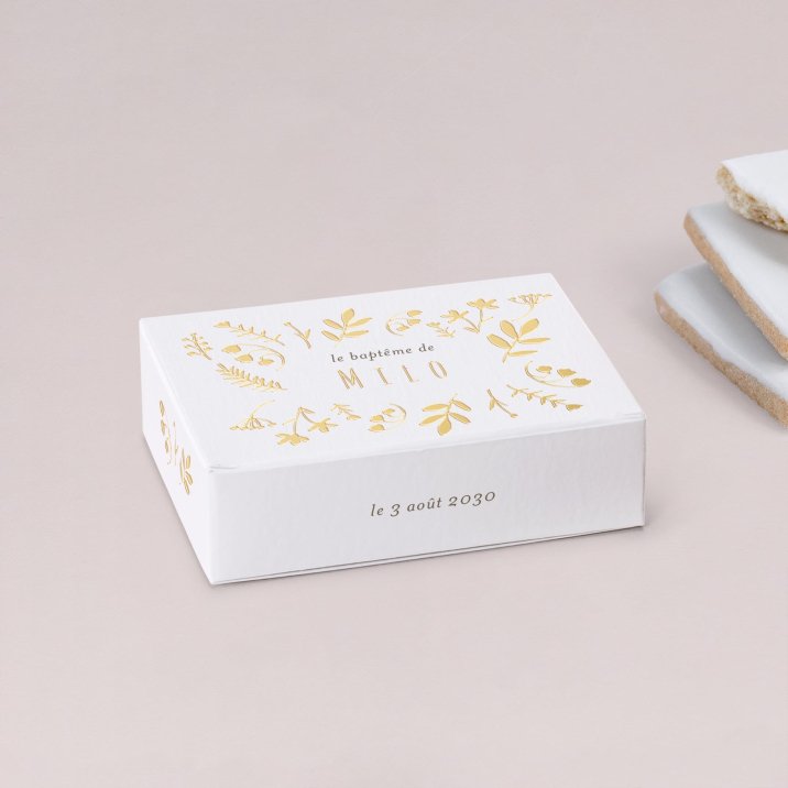 Offrez un élégant souvenir aux proches présents au baptême de votre enfant : la boîte à biscuits personnalisée.