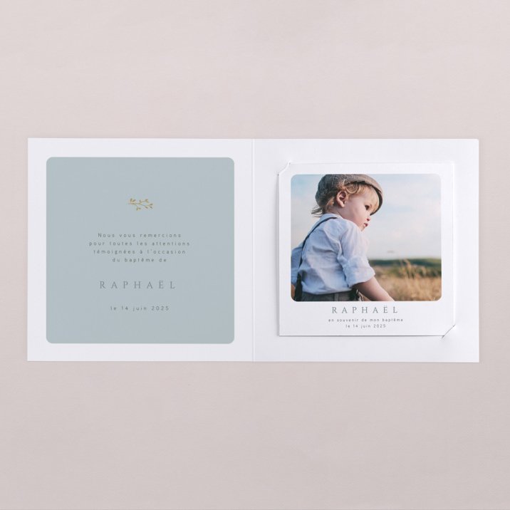 Cette carte de remerciements s'accompagne d'un cadeau glissé à l'intérieur : un polaroid (non magnétisé) de votre nouveau-né, qu'ils pourront conserver en souvenir, afficher selon leur inspiration, utiliser comme marque-page...
