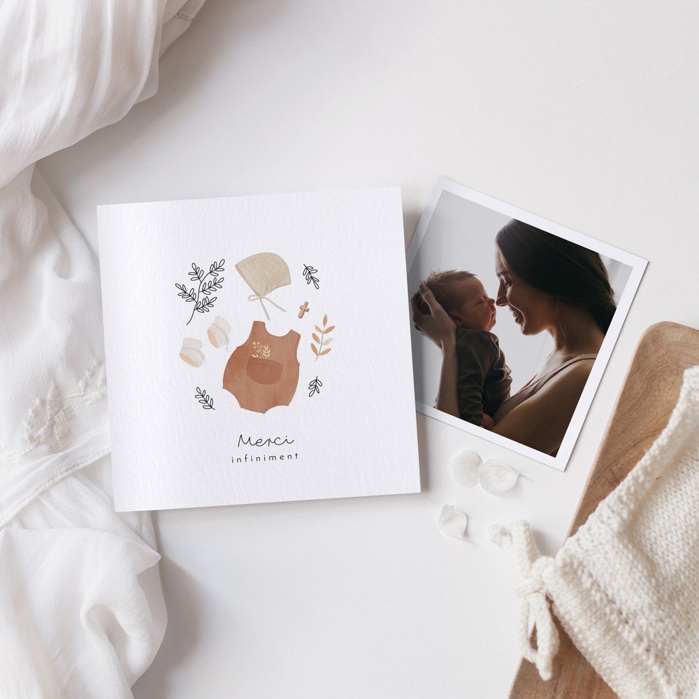 Cette carte de remerciements s'accompagne d'un cadeau glissé à l'intérieur : un polaroid (non magnétisé) de votre nouveau-né, qu'ils pourront conserver en souvenir, afficher selon leur inspiration, utiliser comme marque-page...