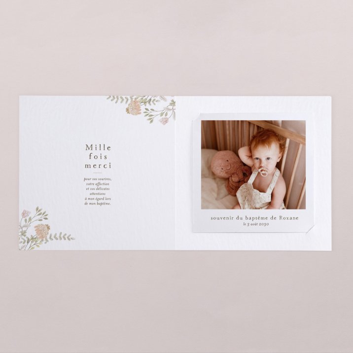 Remerciez les proches qui vous ont entouré et vous ont gâté d'attentions pour le baptême de bébé avec une jolie carte personnalisée.