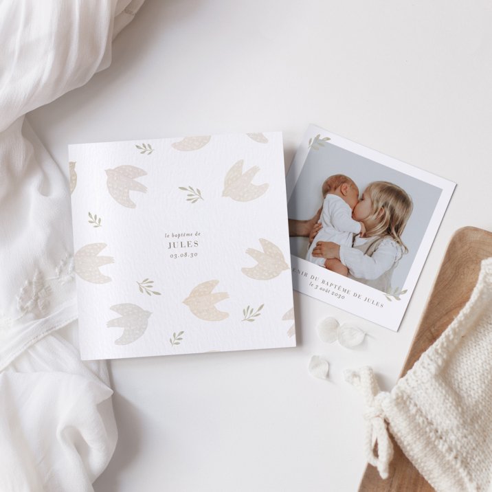 Remerciez les proches qui vous ont entouré et vous ont gâté d'attentions pour le baptême de bébé avec une jolie carte personnalisée. Cette carte de remerciements s'accompagne d'un cadeau glissé à l'intérieur : un polaroid (non magnétisé) de votre nouveau-né, qu'ils pourront conserver en souvenir, afficher selon leur inspiration, utiliser comme marque-page...