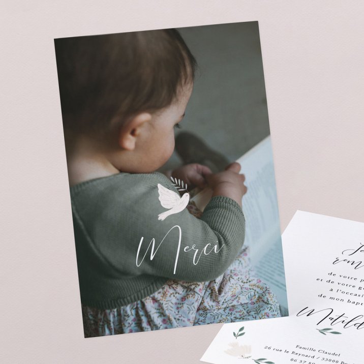 Remerciez les proches qui ont entouré votre enfant lors de son baptême avec une jolie carte de remerciement assortie au faire-part de ce grand jour.