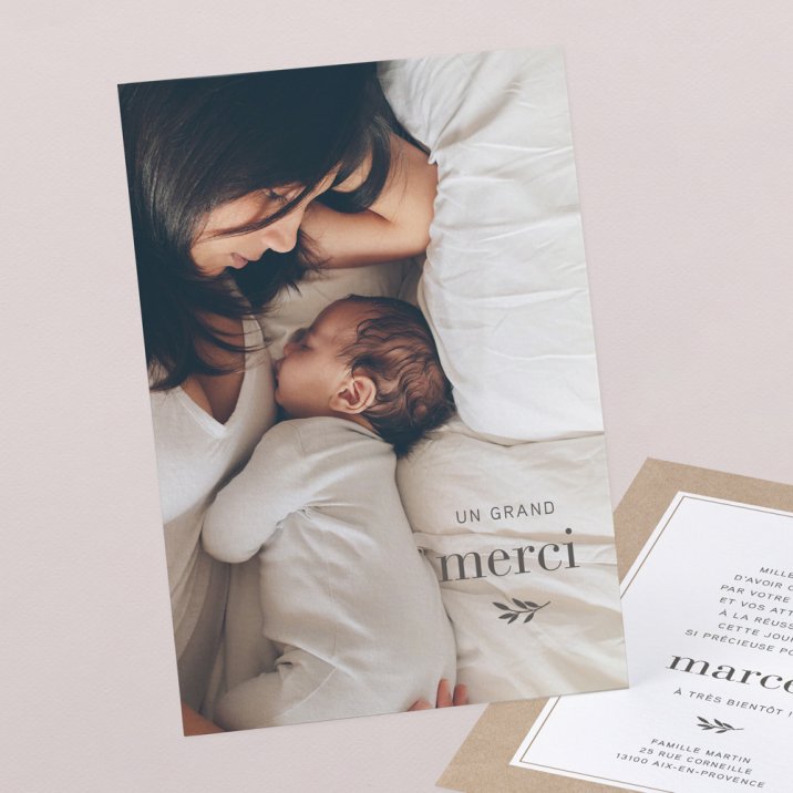 Remerciez les proches qui ont entouré votre enfant lors de son baptême avec une jolie carte de remerciement assortie au faire-part de ce grand jour.