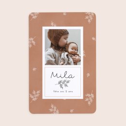 Personnalisée avec la photo de votre petit bout, la carte d'anniversaire Trousseau - Terracotta empreinte de douceur et d'élégance délivrera la plus tendre des invitations.