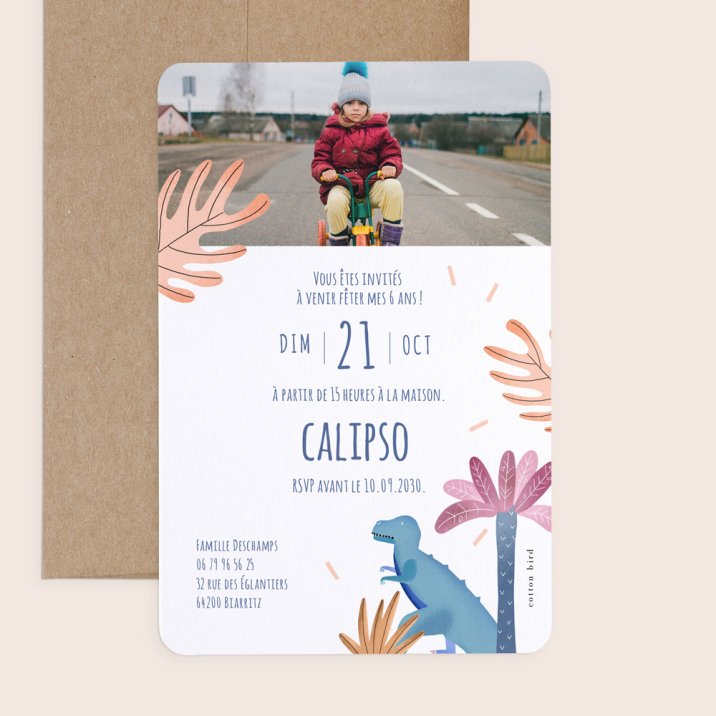 Ambiance dinos et néons fluos avec la carte d'invitation Jurassic dont l'esthétique pop annonce la plus cool des fêtes !