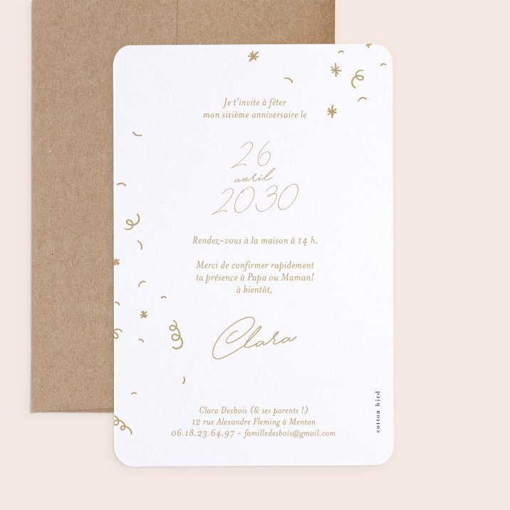 Cette carte haut de gamme au design original et exclusif se personnalise avec tous les détails de la fête d'anniversaire de votre enfant.