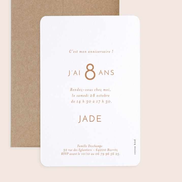 Votre enfant célèbre ses 8 ans? Soulignez son nouvel âge grâce à la carte Clothilde et son incrustation photo personnalisable. Son invitation sera ainsi originale et unique, à l'image de la fête à venir.