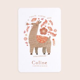 Mascotte de notre carte Mexico, un majestueux lama mène une parade festive pour convier au goûter d'anniversaire de votre enfant. Des ornements d'inspiration sud-américaine illustrés dans des teintes épicées complètent le tableau pour une invitation chaleureuse et dépaysante.