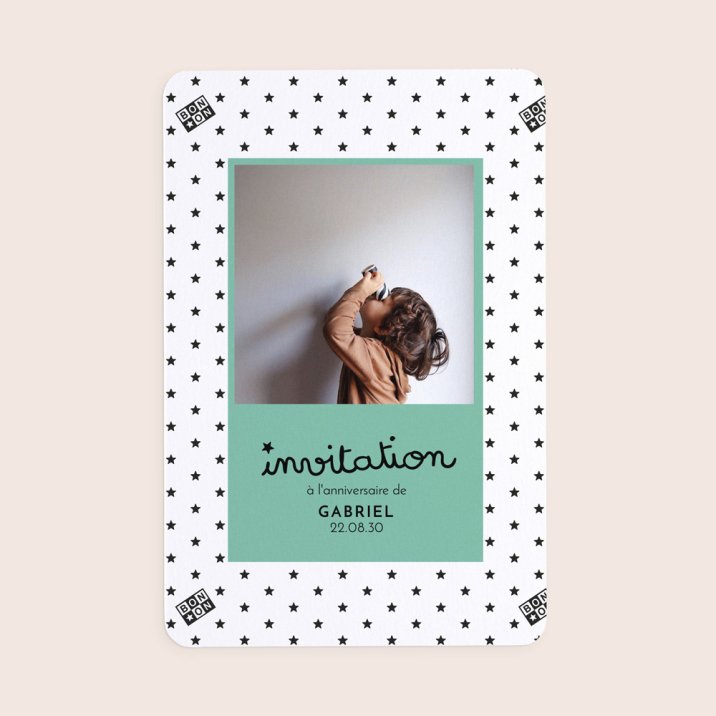 Cette carte haut de gamme au design original et exclusif se personnalise avec tous les détails de la fête d'anniversaire de votre enfant.
