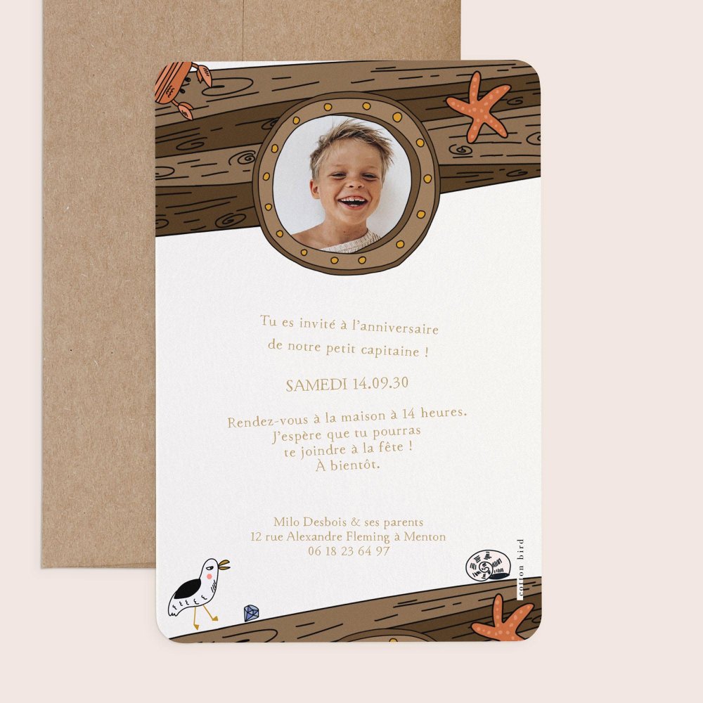 Yo Ho, Yo Ho ! Tous les moussaillons sont invités à célébrer l’anniversaire de votre loup des mers avec la carte Flibustier. Illustrée en hommage à l’univers de la piraterie, cette invitation promet un anniversaire festif digne des plus grands forbans.