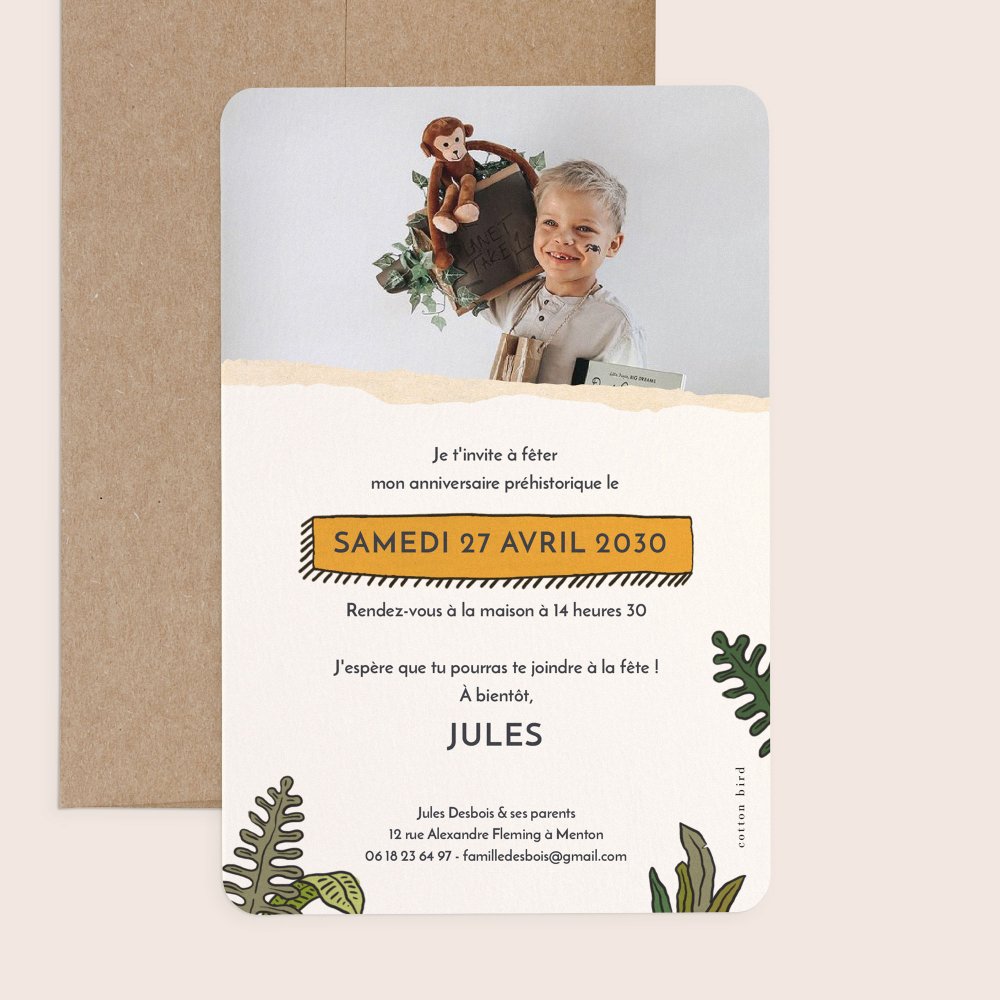 Sur la carte Dinosauria, un T-Rex rugissant annonce l’anniversaire de votre enfant. Illustrée dans un style BD vintage, cette invitation promet une ambiance jurassique pour tous les paléontologues en herbe !