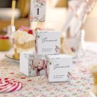 Pour enchanter vos invités, garnissez ce petit cube surprise de délicieuses dragées (disponibles en option), fabriquées artisanalement dans le sud de la France. Nous vous conseillons d’ajouter 20 dragées par boîte (50 g).