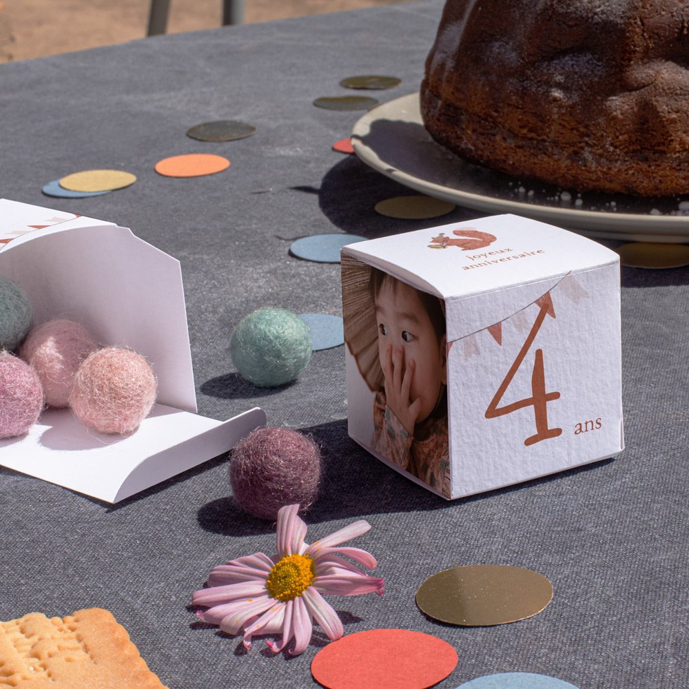 Assortiment de bonbons et autres friandises sucrées, mini figurines, breloques et bijoux fantaisies... faites appel à votre créativité pour garnir votre cube surprise de petites attentions et personnalisez-le avec le prénom de votre enfant, les infos clés de son anniversaire (date, âge...), un petit mot de remerciement...